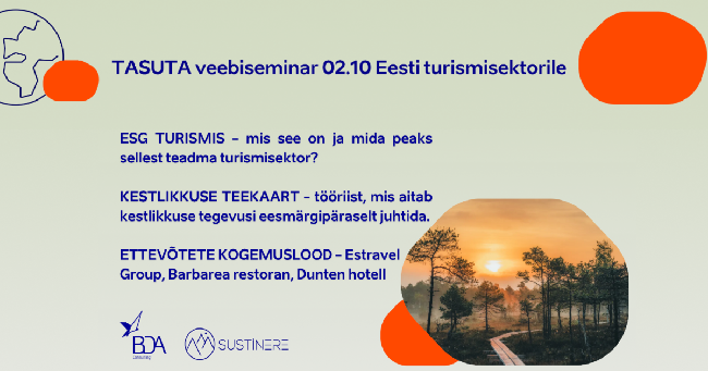 Oktoobri alguses, 02.10 hommikul kell 10-11 on Zoomi vahendusel toimumas TASUTA veebiseminar ''KESTLIKKUSE TEADLIK JUHTIMINE TURISMISEKTORIS'', kus on võimalik kõigil turismisektori organisatsioonidel kuulata lähemalt nii ekspertidest koolitajate kui ettevõtete poolt teadmisi ja kogemusi, mis aitaksid igal asutusel enda tegevusi ESG (environmental-social-governance) mõjude suhtes teadlikult ja jätkusuutlikult juhtida.